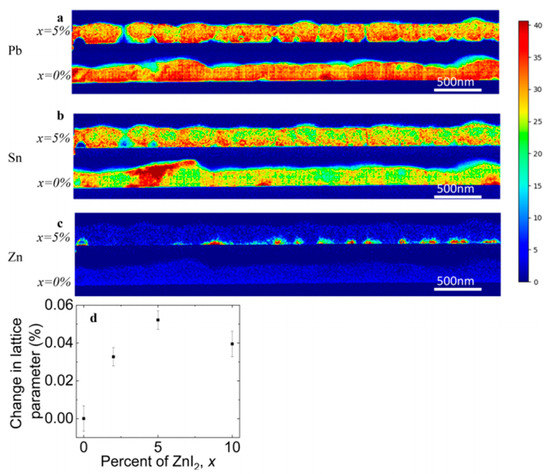 Distribution of elements of FA (Pb0.5Sn0.5)I3 with and without 5% ZnI2 added measured by STEM/EDX. (a) Pb. (b) Sn. (c) Zn. (d) Change in lattice parameter with doping content. Reproduced with permission from ACS Energy Lett. 2019, 4, 2301–2307. Reference [32].