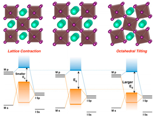 Perovskite lattice and energy levels of undistorted cubic phase (center), with lattice contraction (left) and with octahedral tilting (right). Reproduced with permission from J. Am. Chem. Soc. 2017, 139, 11117–11124. Reference [42].