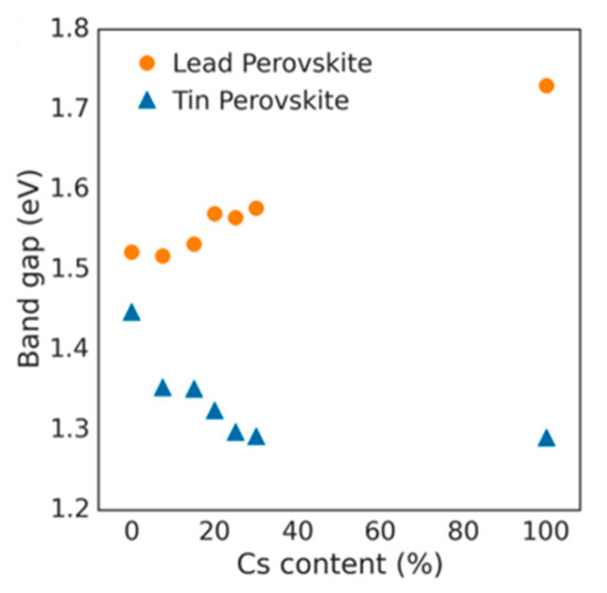 Optical band gap as function of cesium content for perovskites (FA1−xCsx)MI3, with M = Pb or M = Sn. Reproduced with permission from J. Am. Chem. Soc. 2017, 139, 11117–11124. Reference [42].