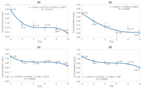 A graph of the heavy-metal concentration (mg/L) over treatment days revealed that the regression (R2) value is positive and close to R2 of 1: R2 for Al is 0.7607, and R2 for Fe is 0.8239 for I. aquatica, and R2 for Al is 0.8182 and R2 for Fe is 0.8862 for C. asiatica. This result indicated that the heavy-metal concentration exhibits a good relationship for reflecting the decrease in the heavy-metal concentration over the treatment day. If the regression was similar to R2 = 1, it verified the relationship between the variables and vice versa, if R2 < 1.