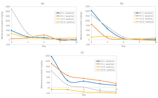 Figure 4 presents the amount of heavy metals according to the treatment period for the leaf, stem, and root sections. The average Al content accumulated by I. aquatica was ~1054 mg/kg per day, while the average Fe content was 972 mg/kg per day. The average contents of Al and Fe of C. asiatica were less than those (~767 mg/kg per day and ~47 mg/kg per day, respectively) of I. aquatica.