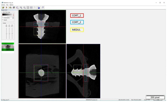 The images were divided into two sections: cortical and medullar. Due to the large medullar cavity, this area was not considered in this study. The analysis of the cortical portion was performed with the help of Data Viewer Software (Bruker microCT NV, Kontig, Belgium). The cortical surface was positioned as parallel as possible regardless of the implant placement, and the volume of interest (VOI) was selected. In this study, only VOIs were considered where the complete cortical appeared: both the proximal and the distal part of the implant must appear surrounded entirely by cortical bone. Once the regions of interest were selected, data were analyzed using CTAn with a threshold of 80–255 for the implant and 30–255 for hard tissue (implant + bone). Bone-to-implant contact (BIC) was evaluated for each sample (Figure 1).