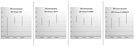 - At four weeks of healing, the RBM-P group obtained the highest BIC values compared to the other experimental groups
