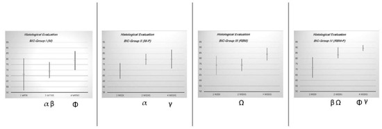 BIC percentages with the C.I. (95%) of each experimental group obtained by histological evaluation at one, two, and four weeks. p values= (α) 0.018; (β) 0.001; (Ω) 0.035; (Φ) 0.018; (γ) 0.024.