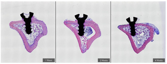 One week after insertion, the osteoid deposit can be observed with areas of newly formed bone. This new bone gradually increases during the second week with the presence of osteoblasts and blood vessels. Meanwhile, in some pitch regions of the thread (areas that were responsible for primary mechanical stability), the bone tissue exhibited signs of bone remodeling [25].
