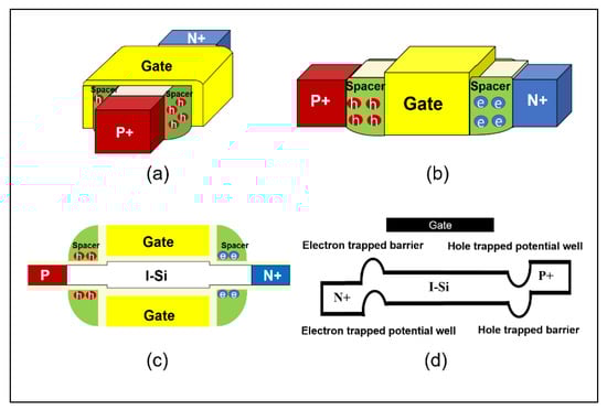 FBFETs were first proposed in 2008 [63]. The design of the new FET is similar, with a P-I-N diode under forward bias. It exhibits positive feedback with double potential barriers. Surrounding the channel region close to the source and drain, gate-sidewall spacers fabricated to trap charges play the role of potential barriers on the FBFET (see Figure 1). Each barrier that blocks the flow of electrons and holes makes it possible to utilize P-I-N diodes as FBFETs. This can be understood and analyzed using energy band diagrams (see Figure 2). The whole steps for the mechanism above are described in detail in Section 2.2.