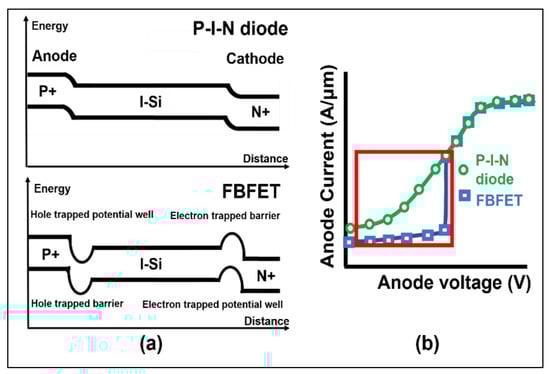 (a) Energy band diagram and (b) current-voltage characteristics of P-I-N diode and FBFET. Note that the anode/cathode of the P-I-N diode is corresponding to the source/drain of the FBFET.