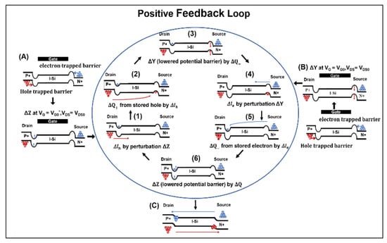 Illustration for positive feedback mechanism. (A) Collapse (ΔZ) occurs in the potential barrier next to the P+ region through a negative gate bias (VG0*) and drain bias (VD0), (B) collapse (ΔY) occurs in the potential barrier next to the N+ region through a positive gate bias (VG0) and drain bias (VD0), (C) energy band diagram of the transistor that is turned on through a positive feedback loop [63,64,65].
