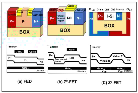 Of these, field-effect transistors (FETs) using a positive feedback mechanism have attracted particular attention. Feedback FETs (FBFETs) show excellent subthreshold swing (~0 mV/decade at 300 K) and high on-/off current ratios (~1010) [18,19]. For those reasons, many researchers have expressed interest in FBFETs and proposed various types of FBFETs, such as positive feedback devices (PF devices) [20,21,22], zero-impact ionization, zero subthreshold swing FETs (Z2-FETs) [23,24,25,26,27,28,29], and zero subthreshold swing, zero-impact ionization, and zero-gate FETs (Z3-FETs) [30,31,32]. In this study, we will summarize the characteristics of FBFETs (i.e., operating mechanism, structure modeling, and transfer characteristics).