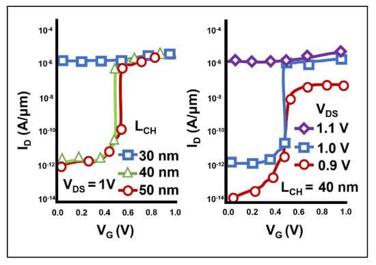 When the channel length decreases, the threshold voltage decreases and the on-/off current ratio increases. However, there are limitations on VDS, depending on the channel length. If the channel length is 40 nm, the VDS value will not be able to cut off the current at 1.1 V. When VDS is 1 V, the channel length of 30 nm cannot cut off the current. As a result, there is a limit on the possible shrinking in FBFET, as shown in Figure 7 [75]. In addition, as the drain current increases, a problem arises in that the value of the potential voltage preventing carrier flow in the drain becomes low [63,64,65,75].