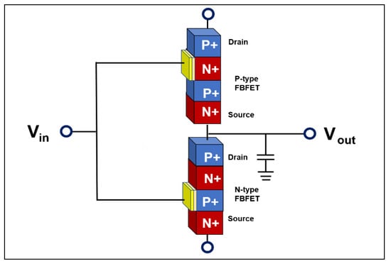 An inverter design that functions properly requires efficient operation of the pullup and pulldown devices. As the device must be operated under a forward bias, the magnitude of VDS should be higher than the built-in potential of FBFET [81]. This can be optimized through various combinations of bias, which requires a significant amount of effort. Nevertheless, the advantages of an inverter with a combined FBFET are as follows: FBFETs have a steep-switching feature and high current on/off-current ratio; moreover, the saturation region is clear, especially beyond VTH. In other words, the amount of current supplied to the operating and non-operating regions can be distinguished by the gate voltage (Vg), and thus the power consumption during operation and in the off-state can become minimal. The steep-switching characteristic of the FBFET is utilized in digital integrated circuits. A typical example is that the switching is controlled by an FBFET in the inverter. In a conventional inverter circuit, as the input voltage continues to increase, the charge stored in the capacitor of the circuit tends to run low over a long period of time [81,82]. However, if the FBFET plays the role of controlling the input voltage supply for the operation of the inverter, the voltage stored in the capacitor changes rapidly at VTH of the FBFET. In addition, starting from VTH, the voltage supply appears as a saturation region, showing stable on/off-states. The FBFET-based inverter is shown in Figure 8.