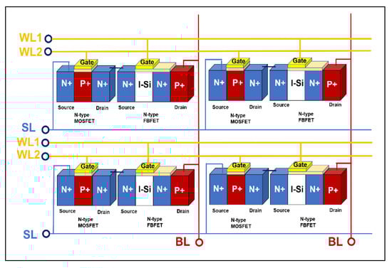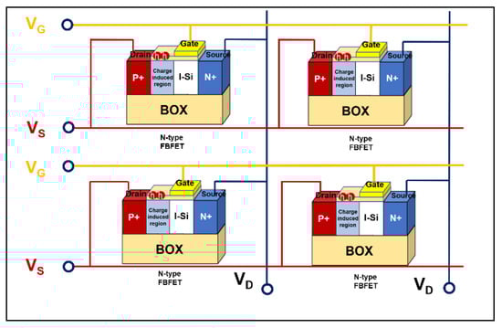 Illustration of a capacitorless dynamic random-access memory (DRAM) circuit composed of an FBFET [43,44].