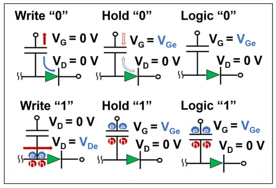 To write the state of ‘0’, the gate voltage is dropped to 0 V to remove the carrier from the channel region located below the gate. Holding state ‘0’ involves returning to a highly negative VG (VGe) range, the device is not in equilibrium because there are no carriers that can be pulled to construct the inversion layer (deep depletion). The rapid change in potential makes the hole injection barrier very steep. To read the ‘0’ state, data is read with a negative pulse. VD should be allowed to select between the measured VDe values in the DC and transient modes, so that the diode does not turn on to ignore uncalled current. State ‘0’ must be refreshed constantly because the energy barrier and VDe are lowered by trapped carriers that are generated to recharge the channel region under the gate (see Figure 10 and Figure 11) [46].