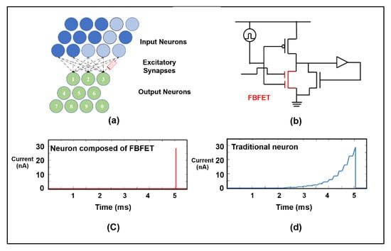 ANNs, which have been developed based on the neurotransmitter structure of biological neurons, have been proposed as a powerful method that can be used in place of conventional Neumann computing, especially for pattern recognition and classification [57,58]. Unlike von Neumann’s existing computer architecture, ANNs have been proposed to solve the problem of not being able to compete with the energy efficiency of the biological brain. A new generation of ANNs have been proposed using spiking neural networks (SNNs) (see Figure 13) [59,60,61,62]. However, the traditional neuron circuits of SNNs require large areas as well as high power consumption. The application of FBFETs to neuromorphic devices is being investigated to solve these issues. PF devices with a split-gate floating body are proposed as new neuron devices that demonstrate integration-and-fire capabilities (see Figure 13). This simulation used a common magnetic controller in the neuron layer and demonstrated the successful operation of a high-density multiple-PF neuron system exhibiting reset and lateral suppression. A reduction in power consumption of ~100 times was reported, demonstrating the potential for use of FBFETs in neuromorphic circuits. The energy consumption of the current is proportional to the number of spikes. The average energy consumption of the total output neurons was reduced by approximately 94% compared to conventional neuron circuits. When the PF device value was applied, a low threshold swing (0.04 mV/decade) of the device was obtained, which reduced the existing 25 pJ/spike of the neuron circuit to ~0.25 pJ/spike (see Figure 13c,d). In addition, charge storage through trapping in the potential walls of the wider body of the FBFET functions to imitate the integration in biological neurons without large capacitors. By replacing the Cmem of the conventional neuron circuit, which requires a large space, by using positive feedback for the charge trap layer of the device, a smaller area and higher density of devices are available. Note that Cmem refers to the membrane capacitor of the average neural circuit. As many transistors and capacitors have traditionally been needed for neuromorphic circuits, creating high density is important for their development. A 17-fold reduction in the area of the neurons was reportedly achieved through the use of FBFETs [21].