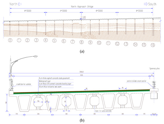Detail of the North Approach Bridge (Unit: cm): (a) Elevation view; (b) Cross-sectional view of the mid-span.