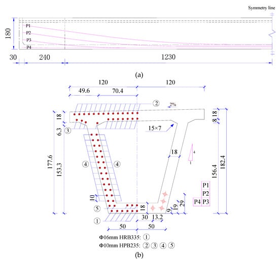 Detail of the 30 m box girder (Unit: cm): (a) Elevation view; (b) Cross-sectional view of the mid-span.