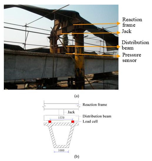 The elevation and cross section of the tested box girder are illustrated in Figure 2. The prefabricated girder was 29.4 m in length, 1.8 m in height, and 2.4 m in width, with a cross slope of 2%. The thickness of the top flange was 0.18 m, and the thicknesses of the bottom flange in the support and mid-span cross section were 0.28 m and 0.18 m, respectively. The thicknesses of web in the support and mid-span cross section were 0.25 m and 0.18 m, respectively.