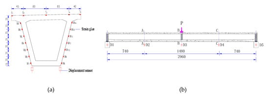 Arrangement of test instrumentation (Unit: cm): (a) Strain gauges; (b) Displacement sensors.