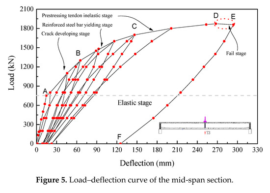 The load–deflection curve of the mid-span section is shown in Figure 5. It can be seen from the figure that the envelope line of the load–deflection curve can be approximated as five lines, representing five stages. These are the elastic stage (OA), concrete crack developing stage (AB), reinforced steel tendon yielding stage (BC), prestressing tendon inelastic stage (CD), and failure stage (DE).