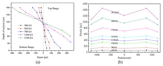 Figure 6a shows the measured strain along the depth at the mid-span cross section. It is clear that the average strain distributed along the depth of the girder agreed well with the plane section assumption. Moreover, with the load increase after cracking, the neutral axis moved toward the top of the girder.