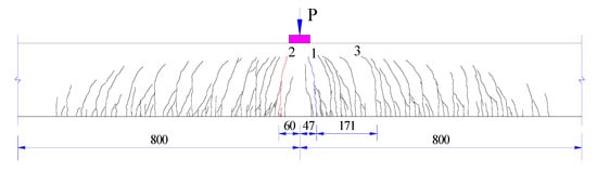 The crack distribution on the web and the maximum crack widths are shown in Figure 7 and Table 5, respectively. It can be seen that when the load was 750 kN, the first crack appeared in the web, 9.2 cm in length and 47.0 cm away from the mid-span. As the applied load increased, the original crack continued to develop in the length and width directions; on the other hand, new cracks occurred at the mid-span. From 750 kN to 1100 kN, the crack was almost completely closed after unloading at each stage. As the load increased to 1600 kN, the maximum width of the unclosed crack was 0.04 mm. When the applied load was more than 1700 kN, the width of the original crack and unclosed crack increased rapidly. At the end of the test, the maximum crack was 176.2 cm in length and 6 mm in width, for which the unclosed width was 0.40 mm. All cracks were distributed within 16 m of the mid-span, and the average crack spacing was about 150 mm.
