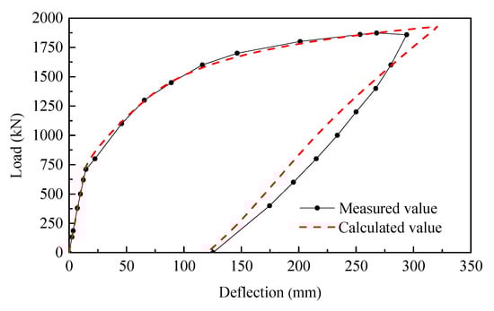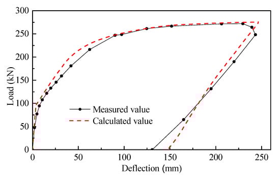 where denotes the ductility index, is the total energy, , and and are the elastic energy and the plastic energy, respectively. As illustrated in Figure 8, and can be calculated from the area of the corresponding part in the load–deflection curve. Based on Equation (1), the ductility index of the tested girder was 1.99. Therefore, the tested girder possessed good ductility.