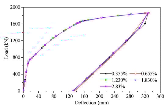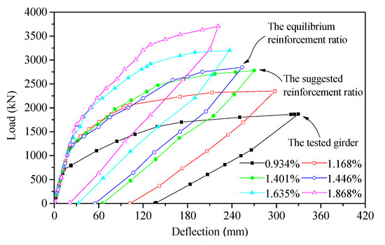 The reinforcement ratio in the compression zone of the tested box girder is 0.655%. Girders with reinforcement ratios of 0.355%, 0.655%, 1.230%, 1.830%, and 2.830% are discussed. The load–deflection curve of the mid-span for each reinforcement ratio is shown in Figure 12.