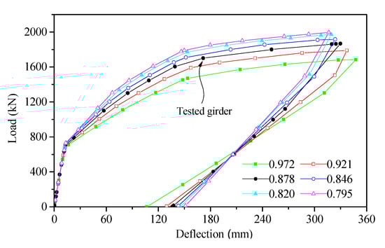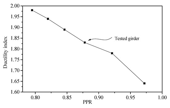 The PPR of the tested girder is 0.878. Girders with different PPRs of 0.795, 0.820, 0.846, 0.878, 0.921, and 0.972 are discussed. The load–deflection curve at the mid-span and ductility index for each PPR are shown in Figure 13 and Figure 14.