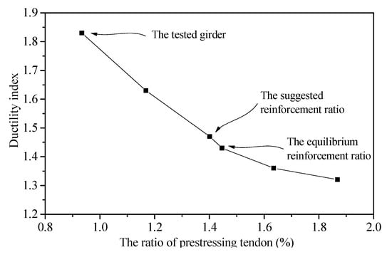 For the tested girder, the ratio of prestressing tendons is 0.934%, and the equilibrium reinforcement ratio is 1.446%. Girders with different ratios of prestressing tendon of 0.934%, 1.168%, 1.401%, 1.446%, 1.635%, and 1.868% are discussed. The load–deflection curve at the mid-span and the ductility index for each parameter are shown in Figure 15 and Figure 16, respectively.