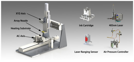 The prototype device consisted of a five-axis motion system (including XYZAC axes, where the XYZ axes were installed using grating scales with an accuracy of ; the repetitive positioning accuracy was , and the AC axes were installed using a 2048 linear decoder with a repetitive positioning accuracy of ), two sets of nozzle arrays, a heating plate, a laser curing system, and a control system.