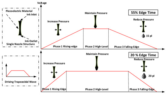 The driving waveform of the piezoelectric nozzle is trapezoidal, as shown in Figure 3 below. This control signal was used to eject the ink. In the same period, as the duty cycle of the rising edge becomes smaller, the amount of the ejected ink increases.