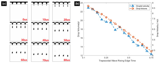 (a) Flow behavior during the simulation process; (b) Simulation results show the impact of trapezoidal wave rising-edge duty cycle on the velocity and volume of the droplet.