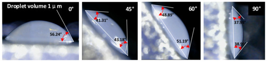 The relationship between the static contact angle of the droplet resting on a solid surface and the surface tensions between the liquid, solid, and air can be described by Young’s equation as follows:
