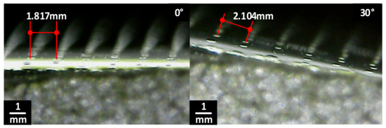 This section demonstrates the problem of changing the distance between droplets on a slanted plate. As shown in Figure 6 below, the separation distances of the droplets on substrates with different slopes have changed considerably. Thus, this study only discusses the spread radius of the droplets falling on the conformal substrate and the distance between the droplets.