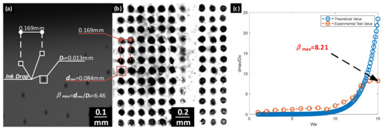 Therefore, the maximum spreading diameter of the droplet can be calculated based on and . The comparison between the theoretical calculation and the experimental measurements of the spreading diameter is shown in Figure 7c.