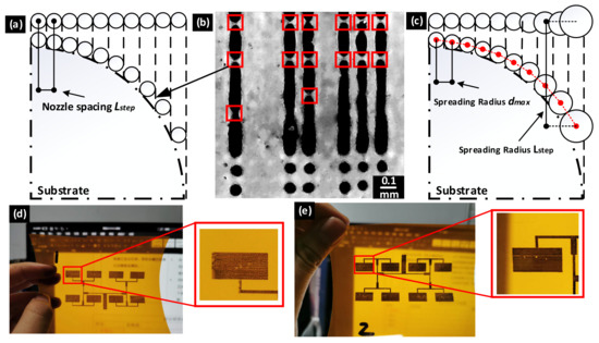 As shown in Figure 8a,b, gaps will form between the neighboring droplets if all the injected droplets have the same sizes. In this case, the droplets will not be able to connect with each other. Figure 8c below shows the printing model calculated based on a simple geometric model. As shown in the figure, as the distance between the nozzle and the substrate increases, the larger the droplet size is required to ensure that all the droplets are connected to each other must increase.