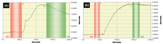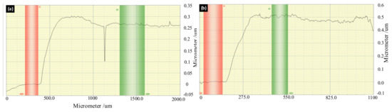 (a) Measured outcomes generated with direct printing with the conventional method, wherein the test area is the edge of the sheet resistivity sample. The lowest area on the left is the substrate, and the elevated area on the right denotes the solid nanosilver particle residue that remains after the ink is dried. The cumulative thickness of the ten-layer nanosilver ink is approximately . (b) Generated results with the use of this scheme have better surface flatness as those in Figure 12a.