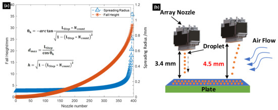 Using a nozzle number of and a spacing of in the arrayed nozzle, the printing condition on a quarter of a circle can be calculated theoretically, as shown in the figure below. Based on experimental measurements, the droplets will be affected by the airflow and the air drift when the fall height becomes greater than 3.5 mm. Based on the experiment, when the jetting distance is greater than 3.5 mm, the droplets will not float to the predetermined substrate position owing to airflow, as shown in Figure 10b below. The smaller the kinetic energy, the more significant will be the effects of the external airflow.