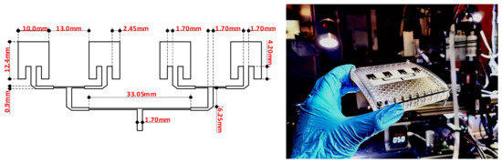 A conformal microstrip antenna array containing four units was designed in this study, as shown in Figure 14. The dielectric constant and dielectric loss tangent of the substrate are 4.4 and 0.02, respectively. A microstrip line was used to feed the microstrip antenna unit. The antenna unit in the array has a dimension of 12.4 × 10 mm. Figure 14 shows the antenna manufactured by arrayed nozzle printing.