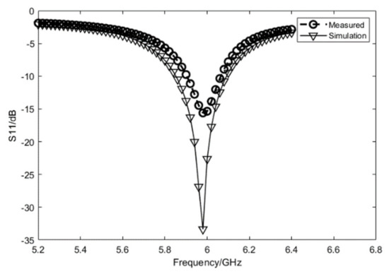 The microstrip arrayed antenna was tested using a vector network analyzer (R&S ZNC). The frequency responses obtained from the simulation and experimental measurements are shown in Figure 15. The return loss of the antenna array at 6 GHz was measured to be -15.6 dB. The return loss in the bandwidth from 5.85 to 6.1 GHz was measured to be -10 dB. This value satisfies the performance requirements. As shown in the simulation and experimental results, the working frequency of the antenna is almost consistent with the original design. This feature indicates a highly accurate dimension of the antenna units during the printing process. The reduction in the return loss may be attributed to insufficient precision when printing extremely thin microstrip lines. This deficiency results in a small loss in the feed network. The difference between the simulation and the measurement results may be caused by the non-uniform thickness of the conductive pattern induced by the flow of the printing liquid.