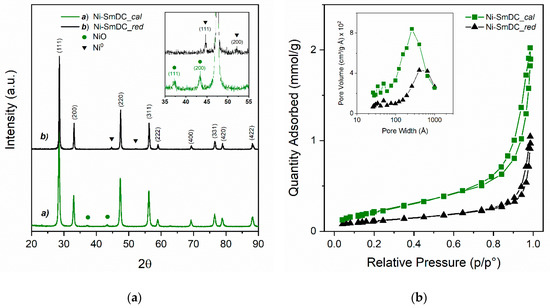 (a) XRD patterns and (b) N2 adsorption/desorption isotherms and pore-width distribution of Ni-SmDC samples after calcination and after reduction treatment at 800 °C.