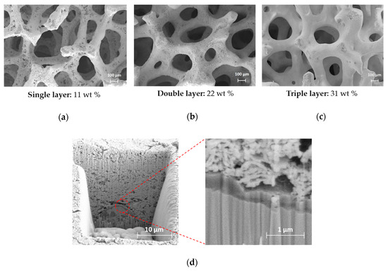 The morphology of the deposited catalyst coating layer was investigated by SEM and FIB-SEM combined system. Figure 3 shows SEM micrographs of single- (a), double- (b), and triple- (c) deposited layers of Ni-SmDC catalyst. The weight gain for each deposited layer is reported below each micrograph. Figure 3d shows the cross-section of double-deposited layer Ni-SmDC/NiCrAl structured catalyst, after FIB milling.