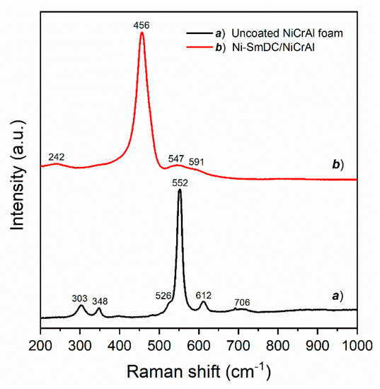 The Raman spectra of NiCrAl foam (spectrum a) and calcined Ni-SmDC/NiCrAl structured catalyst (spectrum b) are shown in Figure 4. In spectrum (a), Raman peaks at 303 cm−1 (A1g), 348 cm−1 (Eg), 552 cm−1 (A1g), and 612 cm−1 (Eg) can be assigned to the Raman modes of Cr2O3 [45,46]; besides a weak and broad peak at 706 cm−1 can be assigned to amorphous CrO2 [46]. A very weak shoulder at 526 cm−1 could be assigned to NiCr2O4 spinel structure [47], whereas there is no evidence of NiO and Al2O3. The Raman results suggest that the surface consisted mainly of chromium oxides, according to the EDX microanalysis previously reported. The Raman spectrum (b) shows a marked peak at 456 cm−1 (F2g), assigned to the Raman mode of CeO2. This peak is broadened and shifted toward lower frequency in comparison to pure ceria because of the lattice defects created by the introduction of Sm3+ dopant ions. The sample shows another weak peak at 242 cm−1 and two broad bands at 547 cm−1 (D1 band) and 591 cm−1 (D2 band), due to the oxygen defects generated by dopant ions in the lattice of ceria. Thus, Raman analysis confirmed that Sm3+ ions formed solid solution with CeO2 [29,48,49].