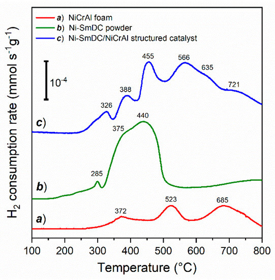 The H2-TPR profiles from room temperature to 800 °C of NiCrAl foam (profile a), Ni-SmDC powder (profile b). and Ni-SmDC/NiCrAl structured catalyst (profile c) are reported in Figure 5. The corresponding H2 consumptions amounts (mmol·g−1) are reported in Table 3.