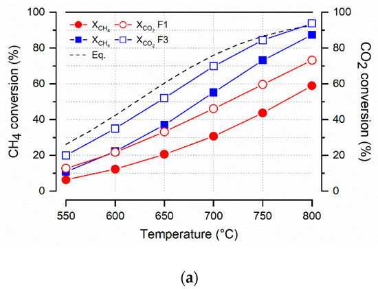 The effect of GHSV and reaction temperature on the catalytic activity of F1 and F3 are discussed. Figure 7 shows the CH4 and CO2 conversion (%) as a function of temperature (a), the corresponding H2/CO molar ratio vs. temperature (b) and the H2/CO molar ratio as a function of CO2 conversion (%) (c). The reaction conditions are: CH4/CO2 = 1, P = 1.3 bar, GHSV = 94,000 h−1 for F1, GHSV = 31,000 h−1 for F3. The equilibrium conversion curves are also added as dashed lines. As expected by the strong endothermicity of the DRM reaction, the reactants’ conversions were promoted by increasing temperature (Figure 7a). The GHSV of F1 (94,000 h−1) was significantly high and the CH4 conversion was quite low going from 6% at 550 °C to 59% at 800 °C, which is well below the thermodynamic value (93% at 800 °C). Moreover, at all investigated temperatures, the CO2 conversion was much higher than that of CH4, reaching a maximum of 73% at 800 °C. As already reported in literature [29,60,61], if the mass transfer limitation effect is negligible, the DRM is better promoted at low GHSV. Indeed, using three structured catalysts (F3), the GHSV decreased to 31,000 h−1 and the CH4 conversion markedly increased going from 10% at 550 °C to a maximum of 87% at 800 °C, much closer to the equilibrium dashed line. Correspondingly, the conversion of CO2 was favored over that of CH4 but the difference between CO2 and CH4 was reduced by increasing temperature. At 800 °C, the CO2 conversion was 94%, corresponding to the thermodynamic value. The always greater CO2 conversion, compared to CH4, was due to the concomitant occurrence of the RWGS reaction Equation (2). Thus, the not-reformed CO2 was hydrogenated by the produced H2, forming CO and H2O and causing an H2/CO molar ratio less than unity in the whole temperature range, as shown in Figure 7b.