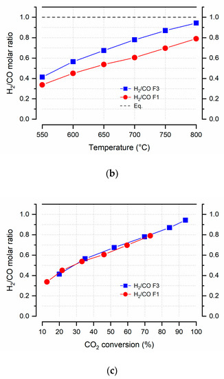 The H2/CO ratio increased towards the thermodynamic value by increasing the temperature and decreasing the GHSV, in agreement with the decreasing difference between CO2 and CH4 conversion values of the F3 system compared to F1. Furthermore, as shown in Figure 7c, the H2/CO ratio increased linearly with the CO2 conversion, independently from the GHSV, confirming that the RWGS was kinetically favored over the DRM and close to thermodynamic equilibrium.