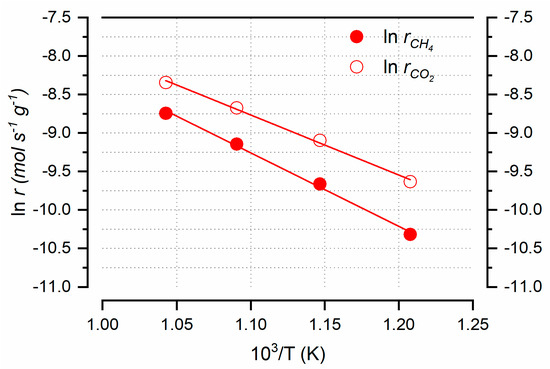Arrhenius plots of CH4 (closed symbol) and CO2 (open symbol) consumption rate in F1.