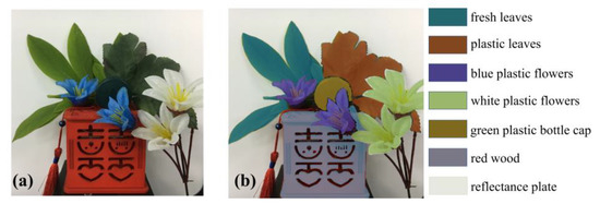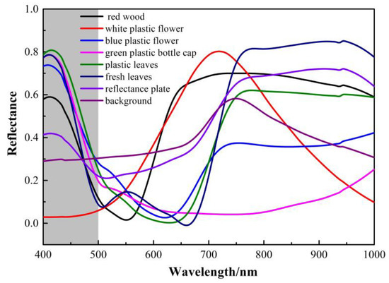 In the experiments, different materials are selected as the objects of interest, including fresh leaves, plastic leaves, blue plastic flowers, white plastic flowers, a green plastic bottle cap, red wood and a calibrated Spectralon reflectance standard plate (Labsphere Inc., USA); they are shown in Figure 2. To avoid the effect of sunlight, active HSI experiments are conducted in darkness. The objects are placed ~5 m away from the active HSI system. At such close distances, the radiation power level of SC laser is enough for illuminating and reflected signal receiving [20]. In actual scenarios, the hyperspectral imager and SC laser may be kept at long distances from the targets, therefore, a higher-power SC laser is needed to ensure sufficient reflected signals can be received by the hyperspectral imager. Under this situation, the radiation power level of SC lasers should be considered seriously by matching the solar irradiance on the ground surface at the spectral range required [11]. The long-distance experiments and applications will be a future research orientation with a high-power SC laser developed.
