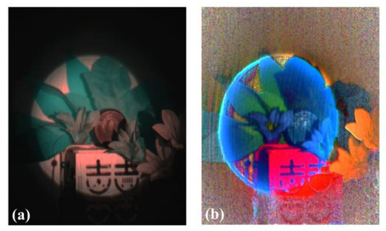 (a) The false-color map of the raw active HSI data cube, constructed with RGB channels using 640, 550 and 470 nm, separately. (b) The false-color map of the active HSI data cube after radiometric calibration, generated by RGB channels using 675, 606 and 520 nm, separately to show clearly.