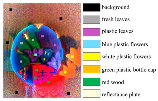In this section, the Image Labeler app provided by MATLAB (https://www.mathworks.com) is used to select ROIs for each objects [1]. Avoiding shadows and highlights, ROIs were chosen manually at perceived representative homogenous surfaces, and their locations at the false-color map are shown in Figure 4 with different colors indicating different materials. Among the ROIs, “background” refers to the lightless areas without objects. The labels and pixel numbers of the selected ROIs for different objects are listed in Table 1. They make up the spectral library and are used to provide training data for the classification.